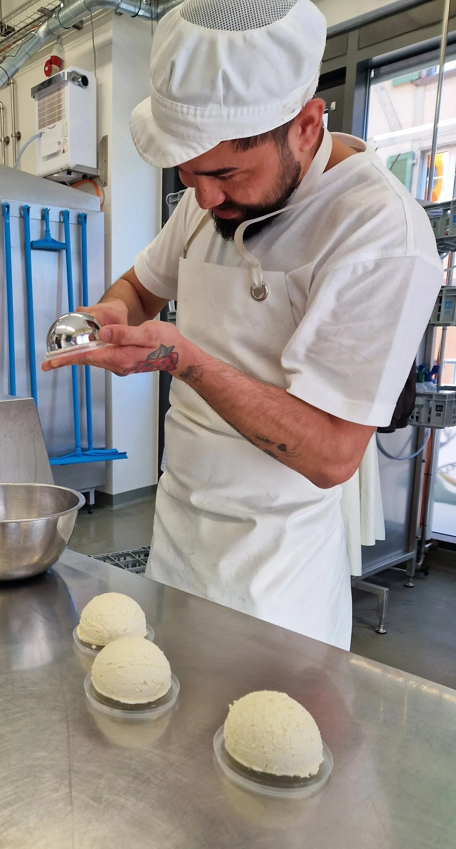 jeden tag, «öpis nach de 7ni am morgä» kommt jeweils die frische milch in die chäsi belp. die milch wird dann dickgelegt und über nacht gepresst. am nächsten tag wird die masse mit blau- und weisschimmelkulturen von peter vermischt.